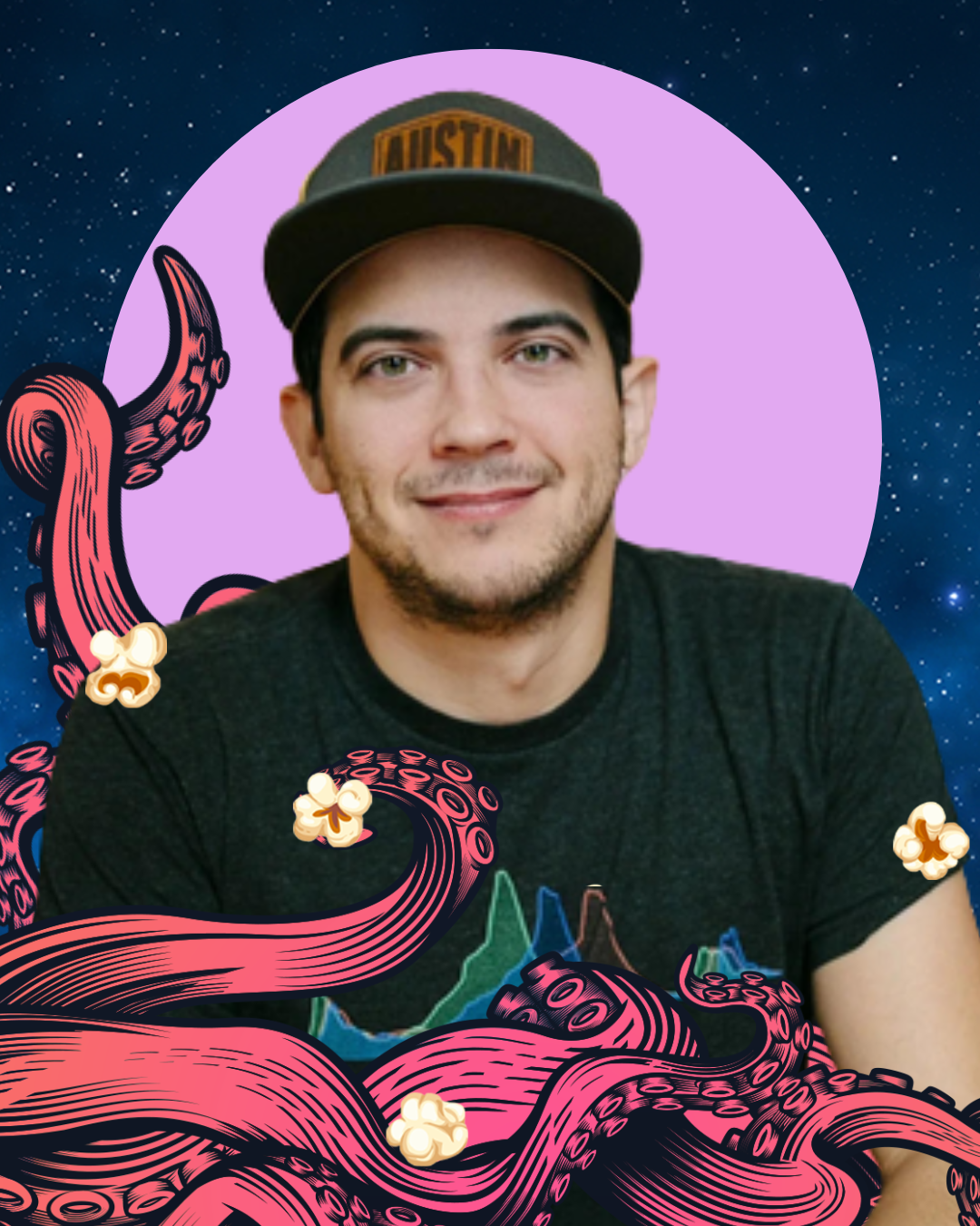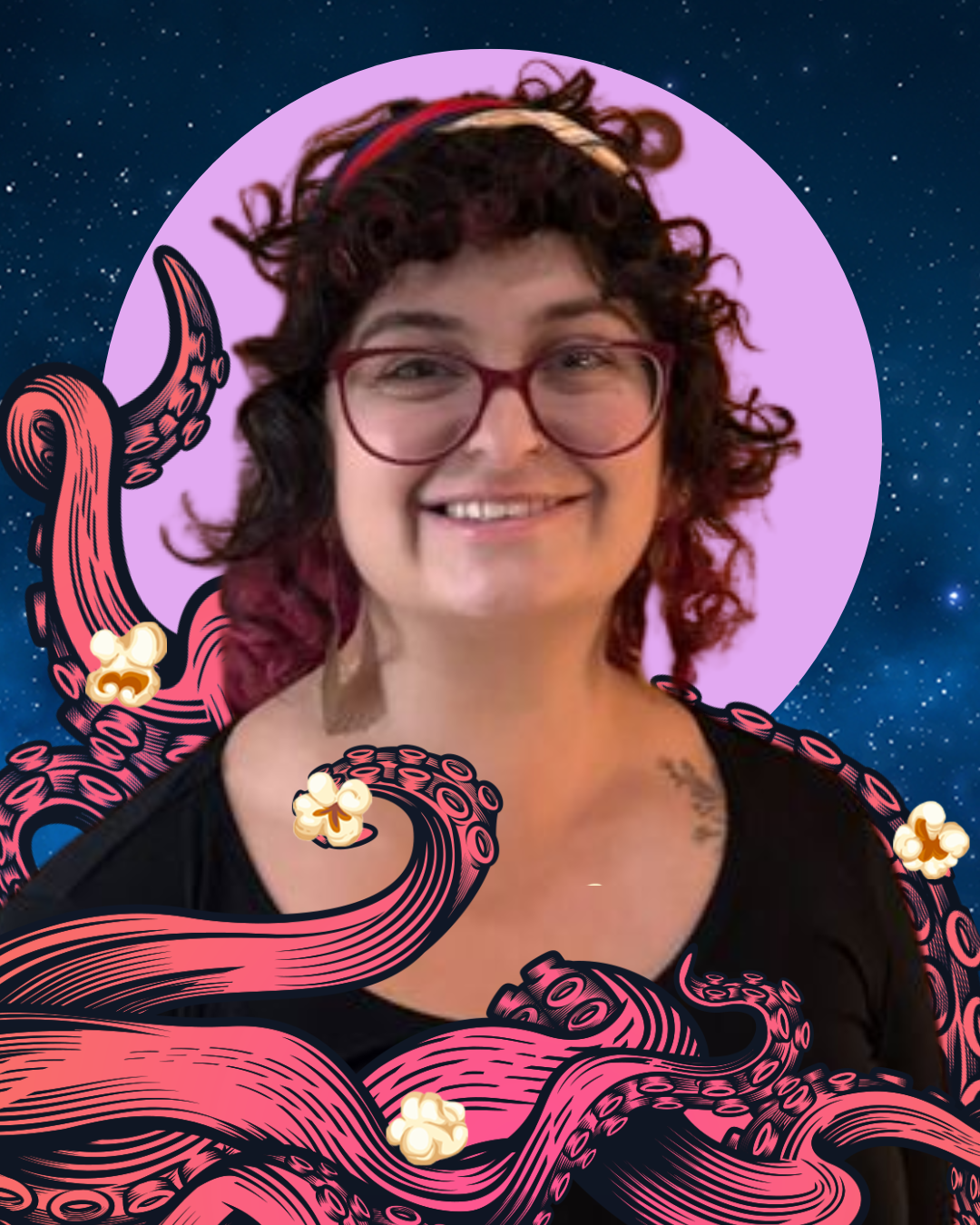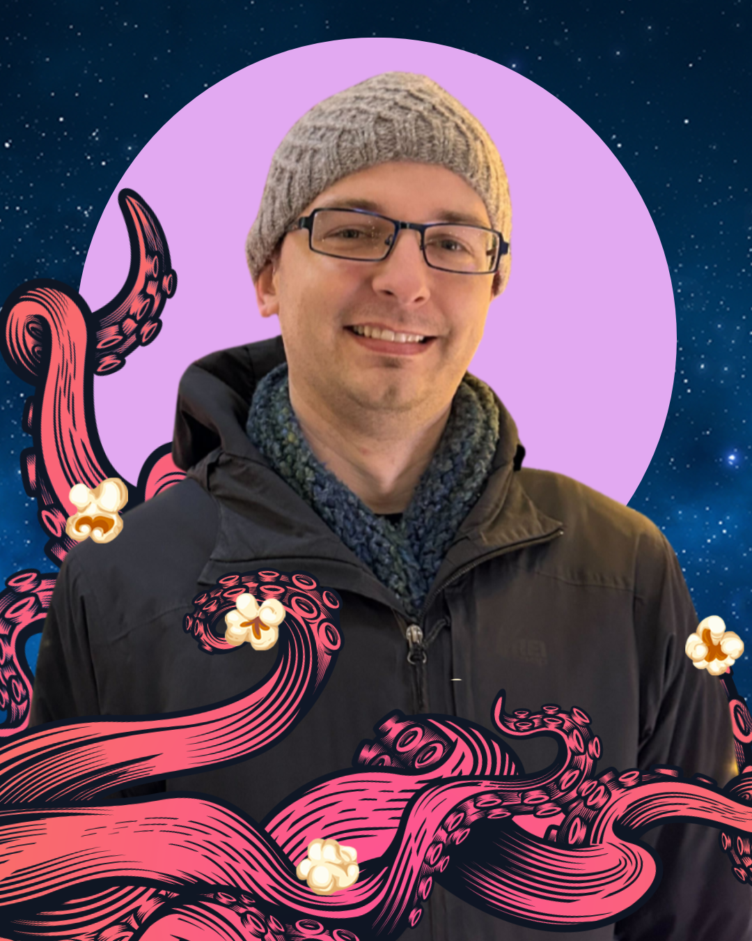 ID: Seattle Deaf Film banner of 2026 SDFF Film Lineup with octopus’ tentacles curling across with some popcorn floating in the starry space.