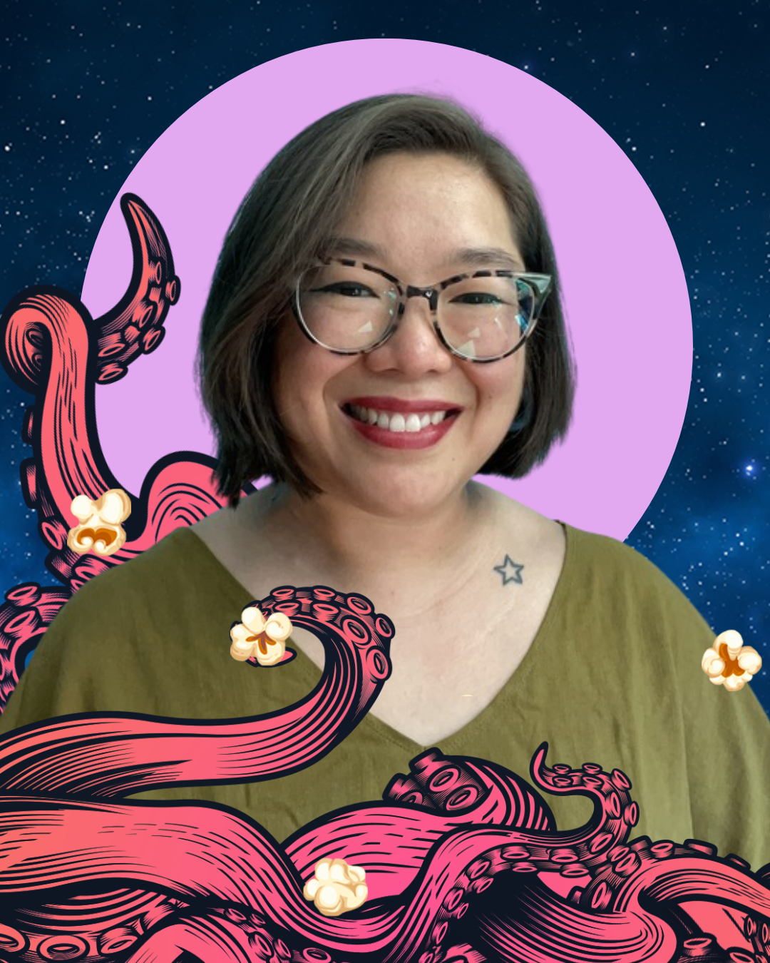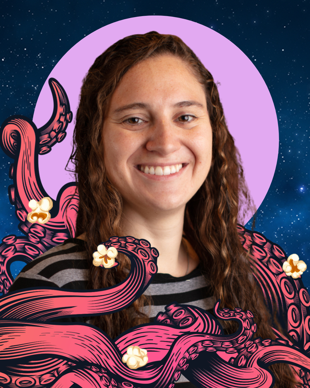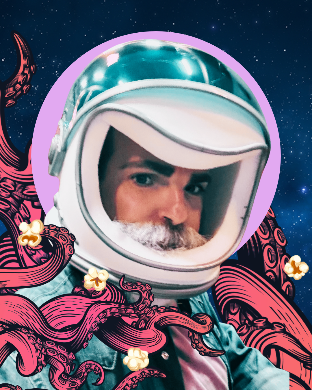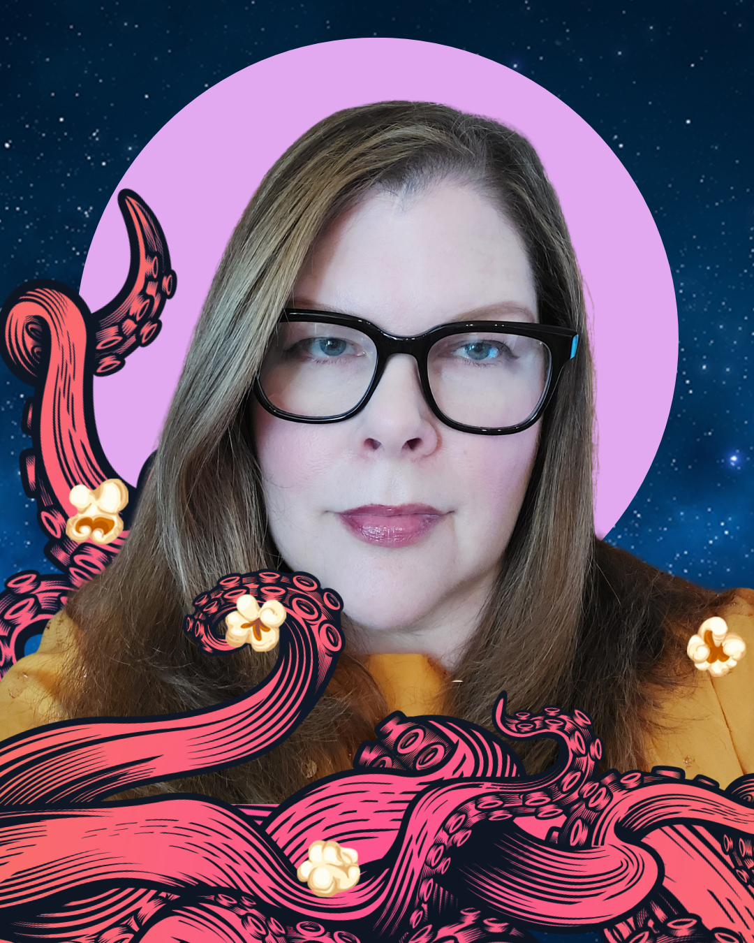 ID: Seattle Deaf Film banner of 2026 SDFF Film Lineup with octopus’ tentacles curling across with some popcorn floating in the starry space.