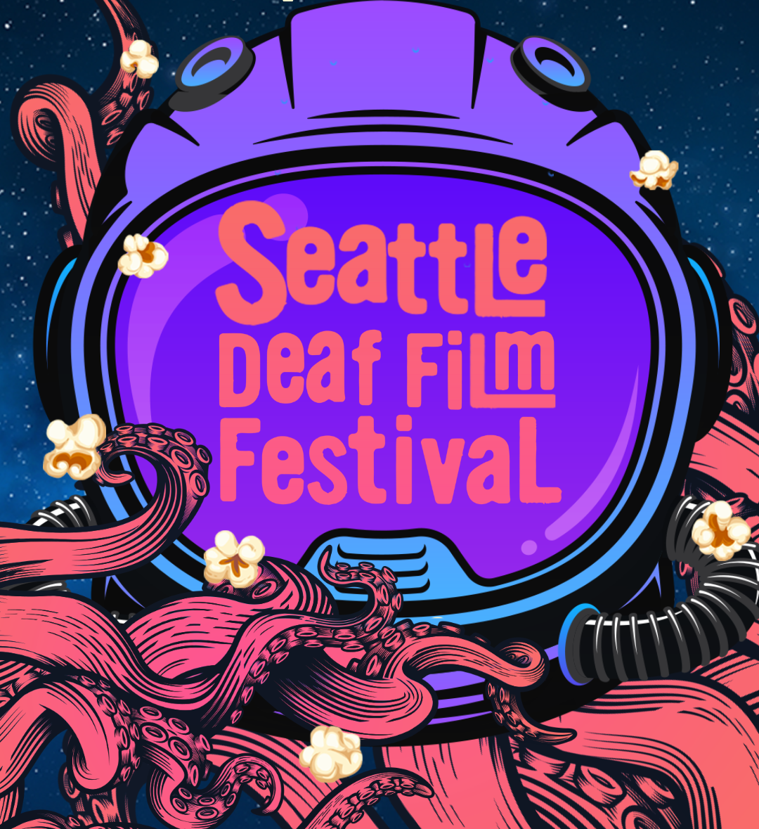 ID: A dark blue starry banner with an orange pink octopus with a helmet with text: “Seattle Deaf Film Festival, April 2026” from the left edge with flying popcorns scattered throughout the banner. Text on right: “April 10-12, 2026, Northwest Film Forum, Seattle, WA. Streaming: April 13-26, 2026”.