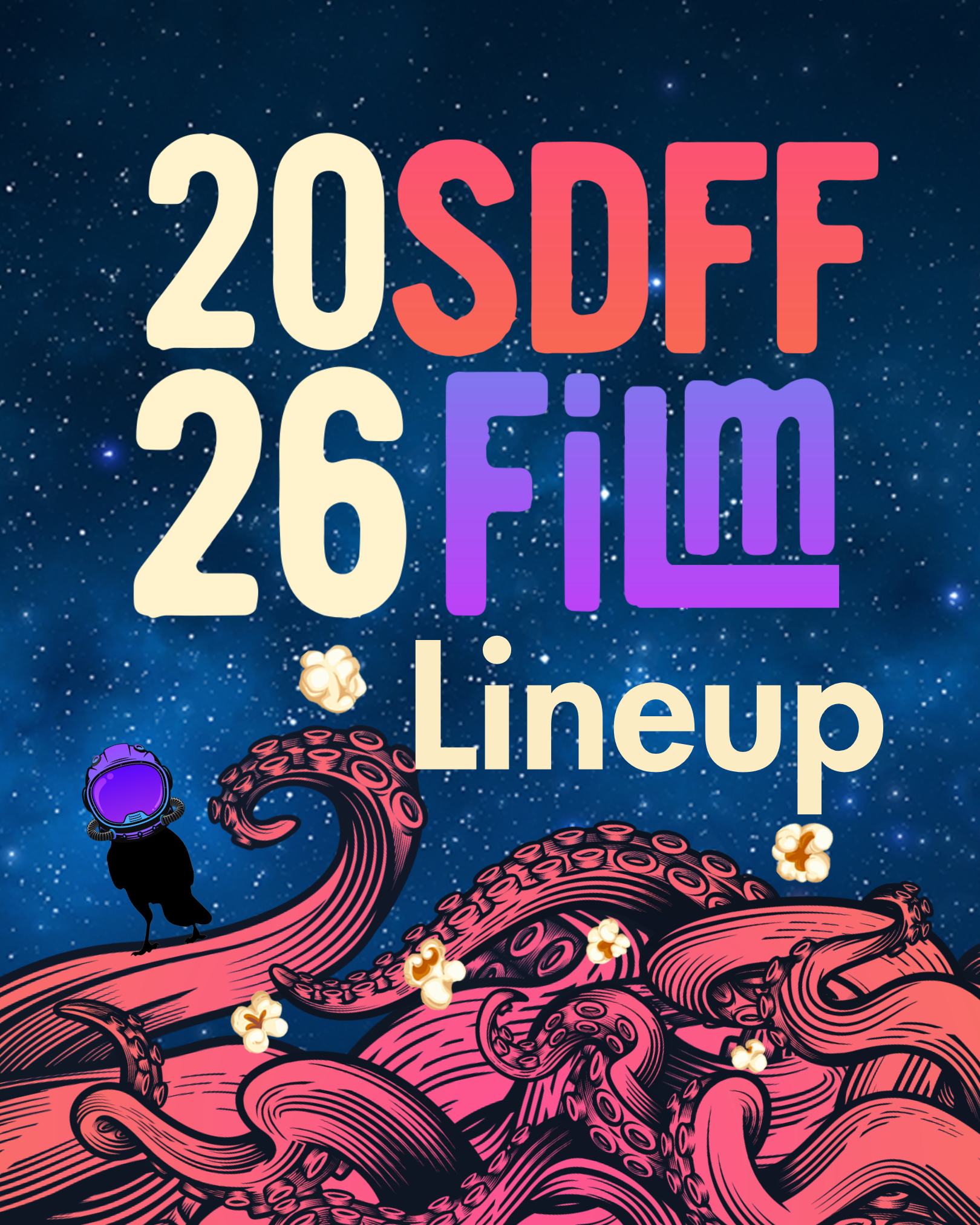 ID: Seattle Deaf Film poster of 2026 SDFF Film Lineup with a crow astronaut perched on an octopus’ tentacles curling across with some popcorn floating in the starry space.