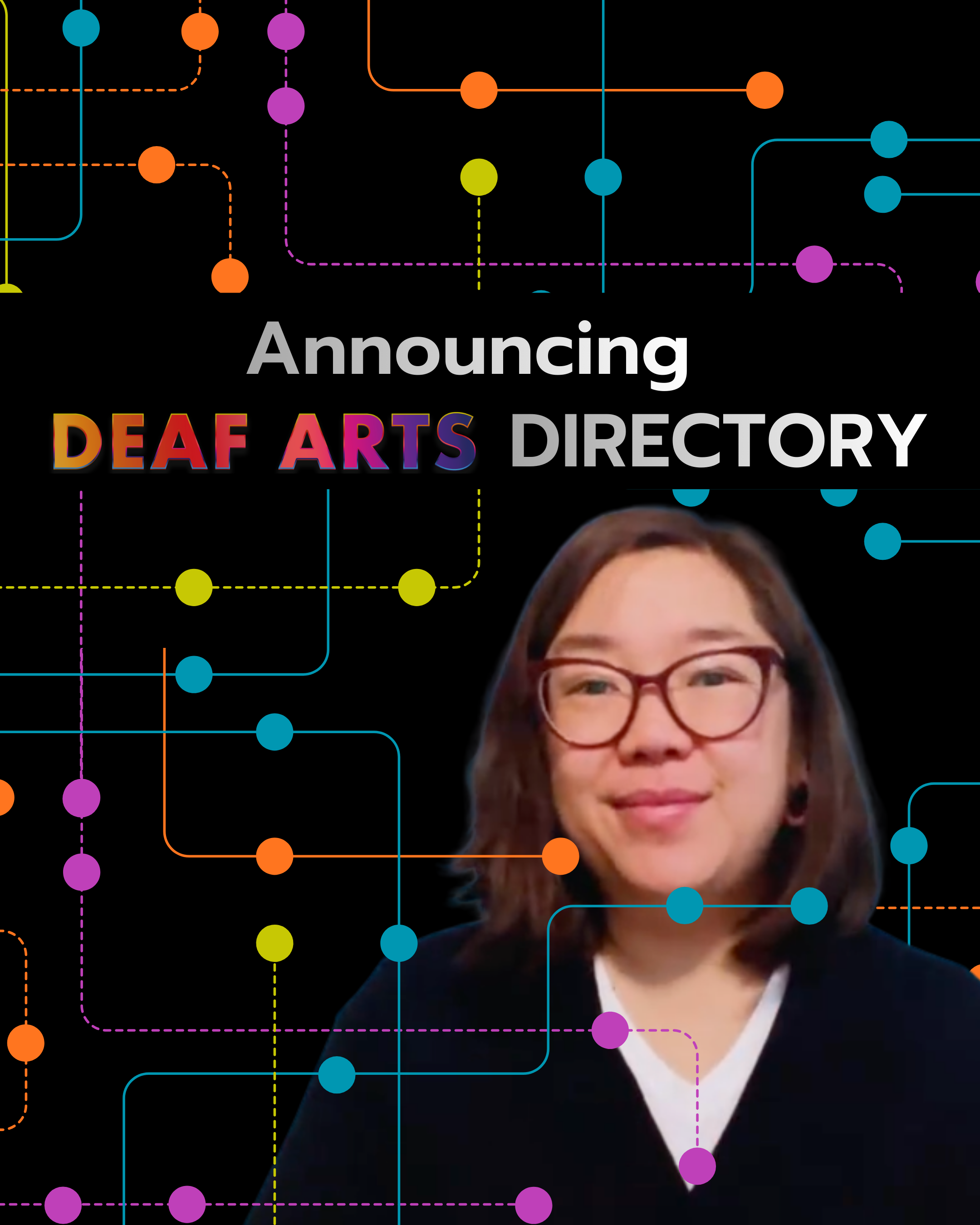 ID: Deaf Arts Directory announcement. Patty Liang, Deaf Spotlight Executive Director, in front of a blue background. Patty, a Chinese American woman with dark hair wearing eyeglasses and a dark shirt with white shirt underneath.