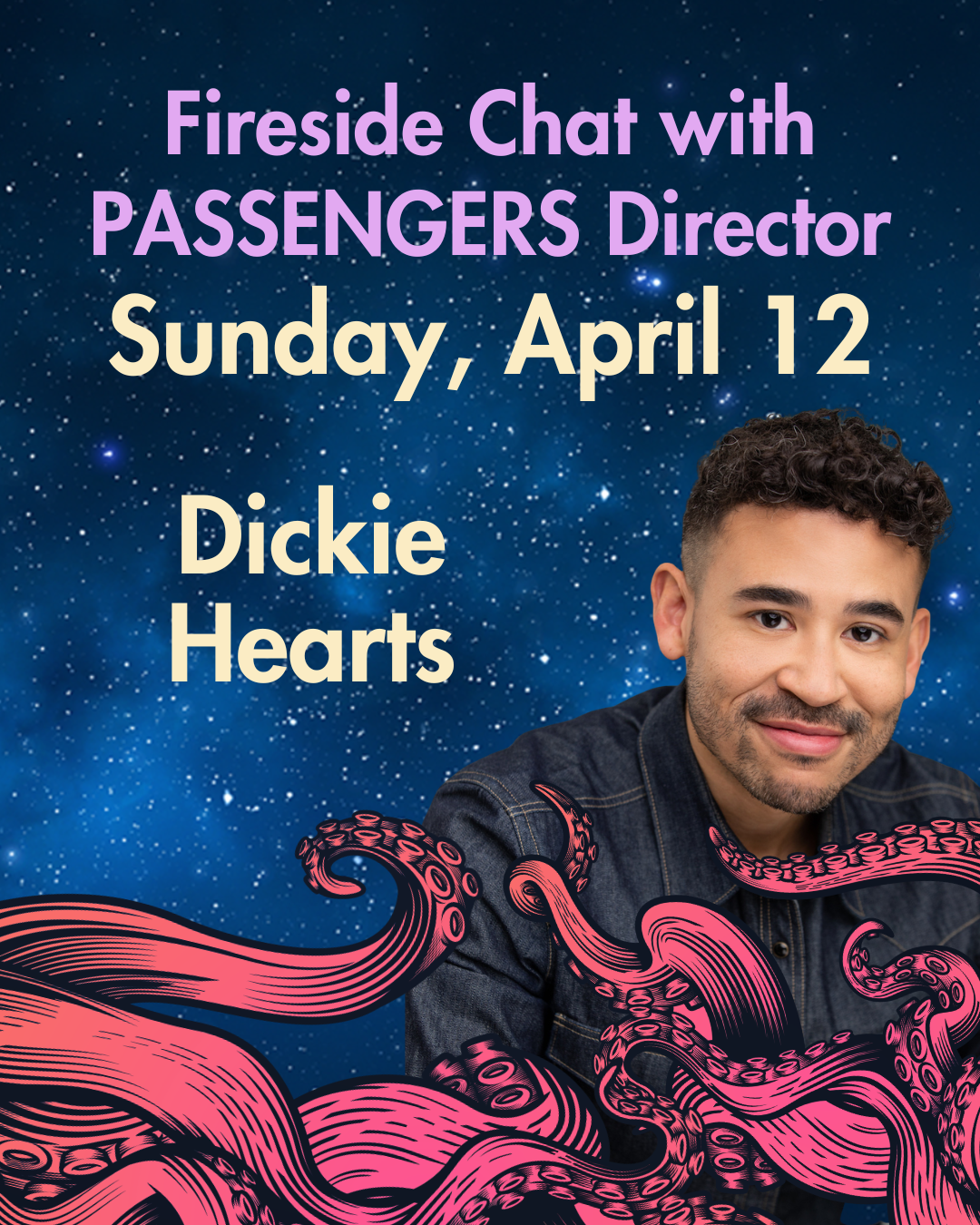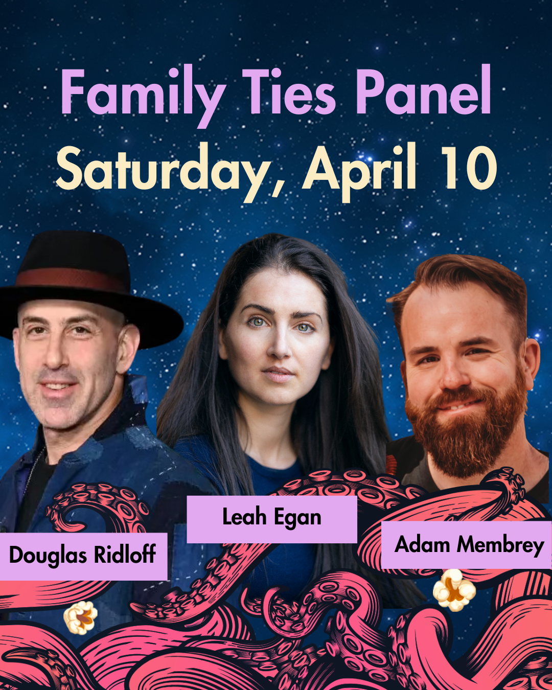 ID: Flyer with “Tickets & Passes Available!” on an illustration showing octopus appendages in space with an astronaut orbiting a planet in the background. Popcorn kernels fly around. Text underneath title: “Seattle Deaf Film Festival. April 10-12, 2026. Northwest Film Forum. Streaming: April 13-26, 2026.”