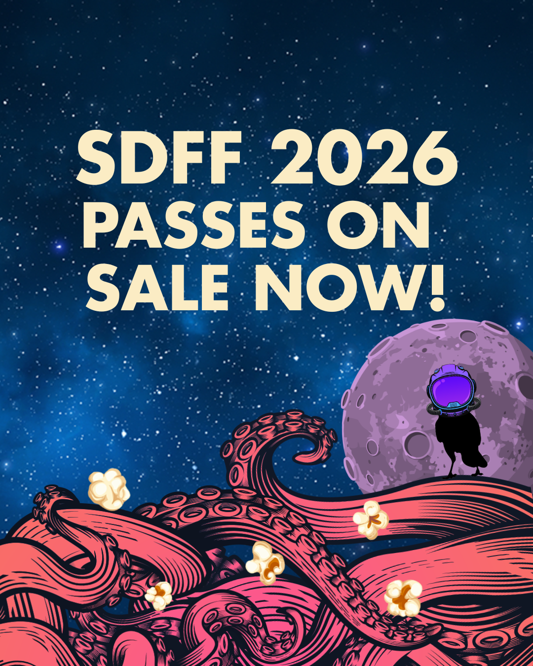 ID: Poster for SDFF with text on top: “SDFF 2026 Passes on sale now!” Below is a illustration of a red octopus with popcorn kernels on it. Behind them is a crow astronaut hovering with a planet behind them. The water resembles a starry sky.