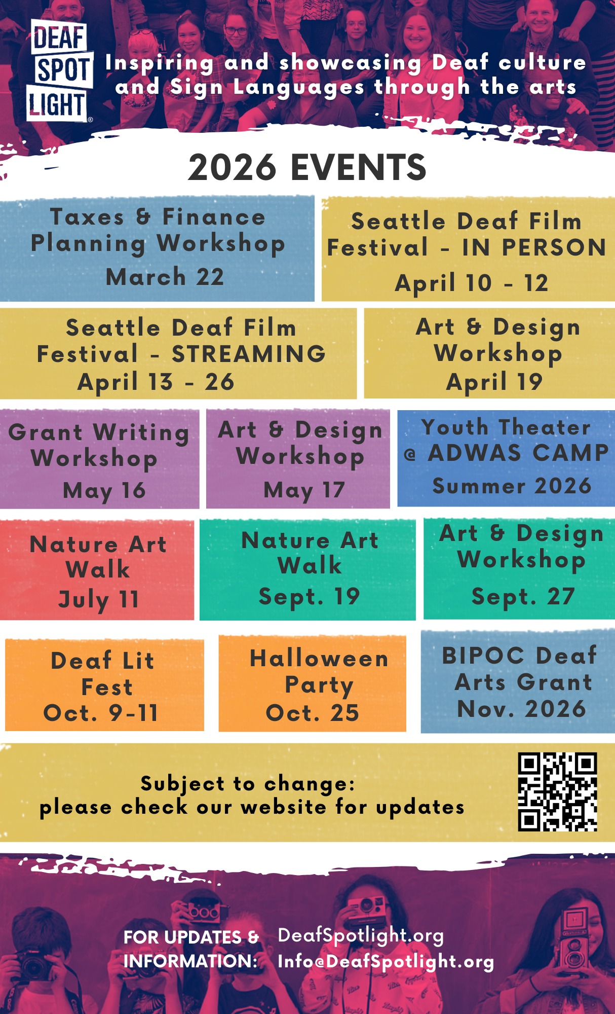 ID: Infographic with rows of colorful blocks with text inside. Across the top is a purple and pink banner with the Deaf Spotlight logo on the left side, “Inspiring and showcasing Deaf culture and Sign Languages through the arts”. Below, “2026 Events”. Text inside the blocks, from top to bottom: Taxes & Finance Planning Workshop March 22; Seattle Deaf Film Festival - IN PERSON, April 10-12; Seattle Deaf Film Festival - STREAMING, April 13-26; Art & Design Workshop, April 19; Grant Writing Workshop, May 16; Art & Design Workshop, May 17; Youth Theater & ADWAS Camp, Summer 2026; Nature Art Walk, July 11; Nature Art Walk, Sept 19; Art & Design Workshop, Sept 27; Deaf Lit Festival, Oct 9-11; Halloween Party, Oct 25; BIPOC Deaf Arts Grant, Nov 2026; Subject to change. Please check our website for updates (QR code block).” Text across the pink & purple bottom: For updates & information: DeafSpotlight.org , info@deafspotlight.org .