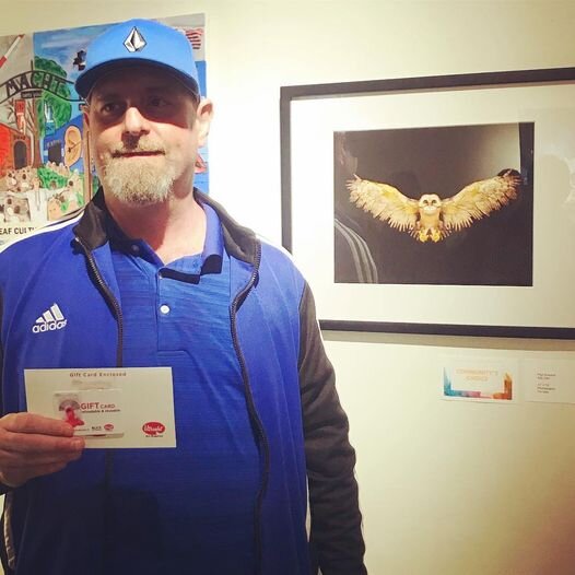 ID: Paul Searce in a blue top with a blue and black jacket holding up an art store gift card front of a framed artwork of an owl in flight with handshapes.