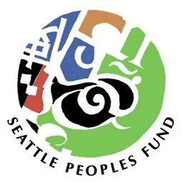 Seattle People Fund logo: a white background with white cursive artwork inside a circle with different colors: blue, yellow, red, black and green with text following the curve at bottom: SEATTLE PEOPLE FUND.