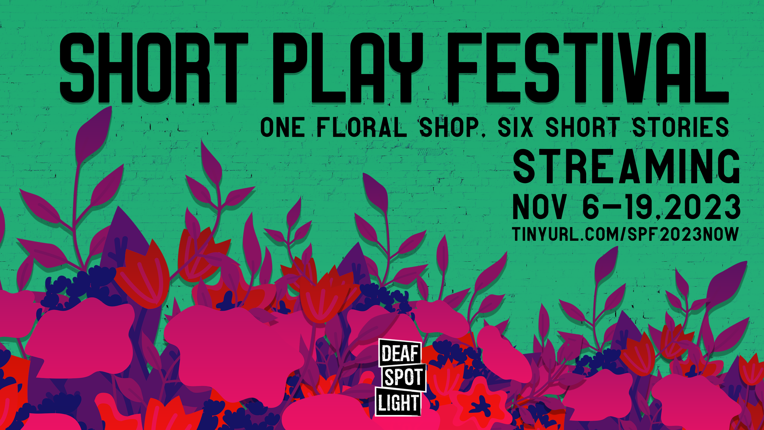 Upper ID: a green background with colorful flowers growing out of the right bottom corner with black capitalized/shadowed text: “Short Play Festival, One Floral Shop. Six Short Stories. Streaming: Nov 6-19, 2023."
