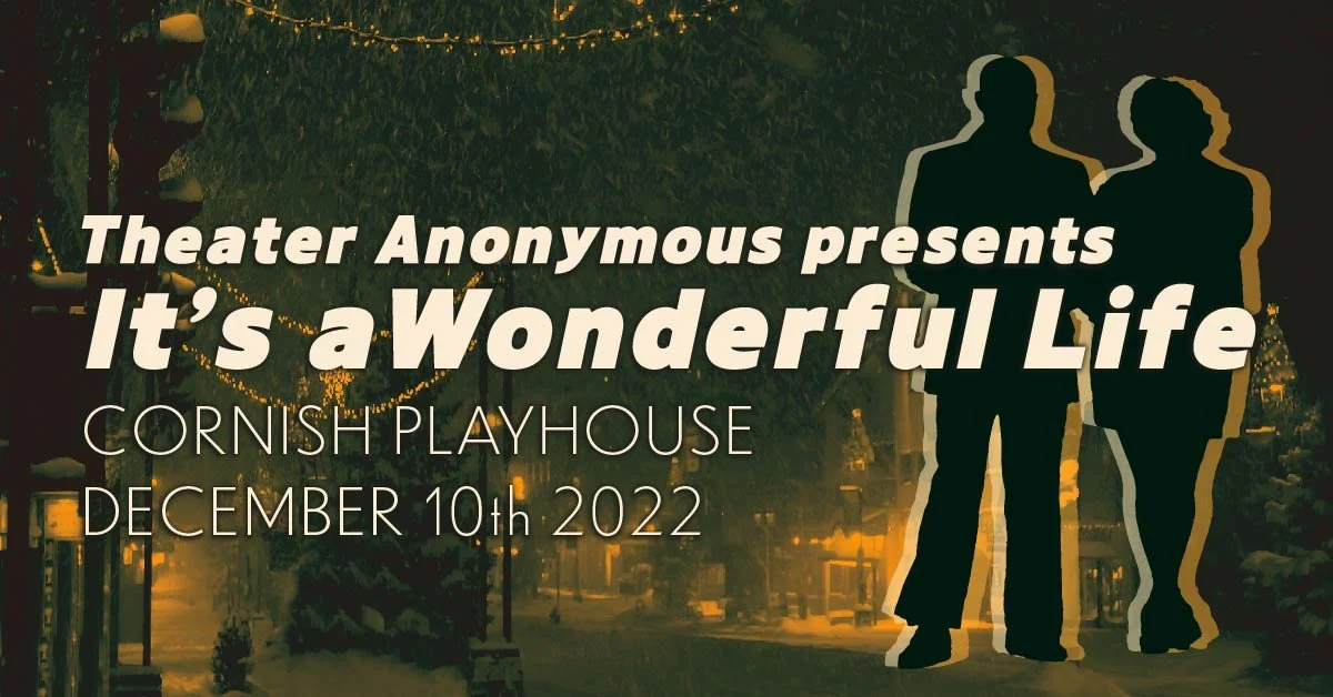 ID: a photo banner of a snowy main street and two people’s silhouettes looking outward to the main street. Text: “Theater Anonymous presents It’s a Wonderful Life, Cornish Playhouse, Dec 10th, 2022.”