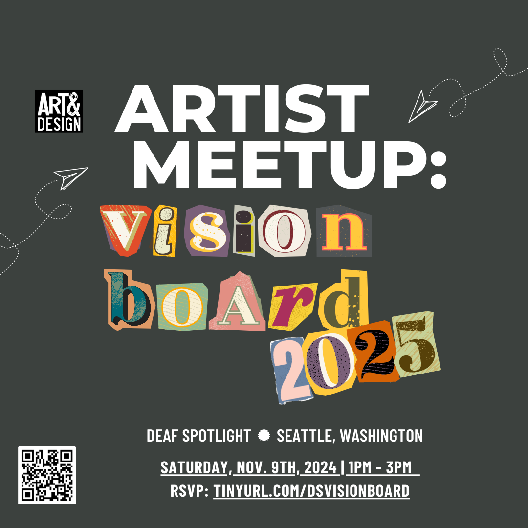ID: Flyer with gray background. White text on top: "Artist Meetup:" with two white paper airplanes on either side and small black square with white text: "Art & Design" on left. Middle text with letters in various colors and fonts as magazine cutouts: "Vision Board." "2025" is on slant below "rd." White text on bottom: "Deaf Spotlight. Seattle, Washington." Underneath are white underlined text except for "RVSP": "Saturday, Nov. 9th, 2024. 1 PM - 3 PM. RSVP: TINYURL.COM/DSVISIONBOARD." QR code in lower left corner.