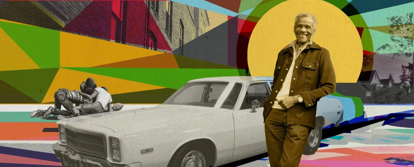 ID: In the background, it shows the colorful blocks with a snippet of a black-and-white photograph of buildings. On the left side, a black and white photograph of three children huddling on the ground. Forefront is a sepia photograph of a Black man grinning, standing in front of the car.