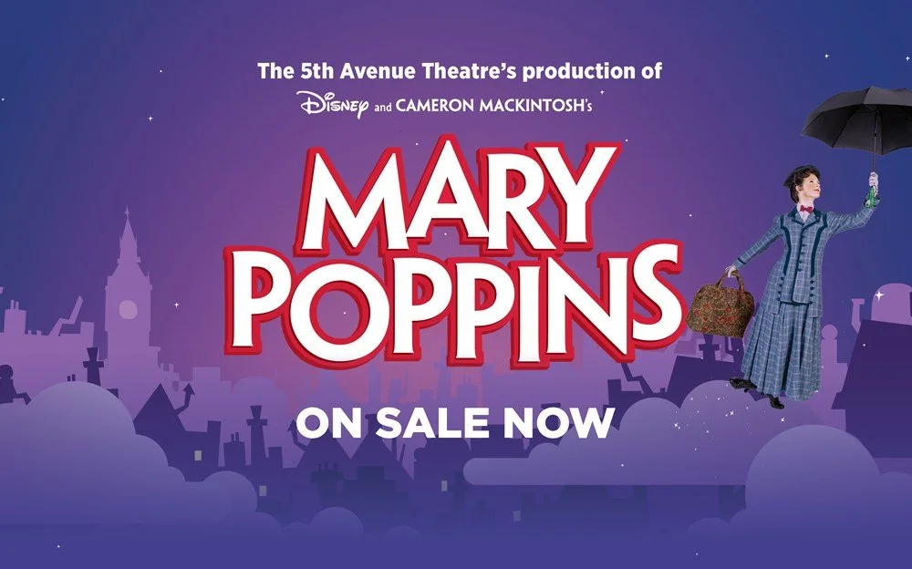 ID: The poster has a purple background with the skyline of London. In the foreground on the right side of the poster, a woman in a dress is floating with her open umbrella; she is also carrying a bag. In the middle, in white letters, “The 5th Avenue Theatre’s production of Disney and Cameron MacKintosh’s Mary Poppins. On Sale Now.”