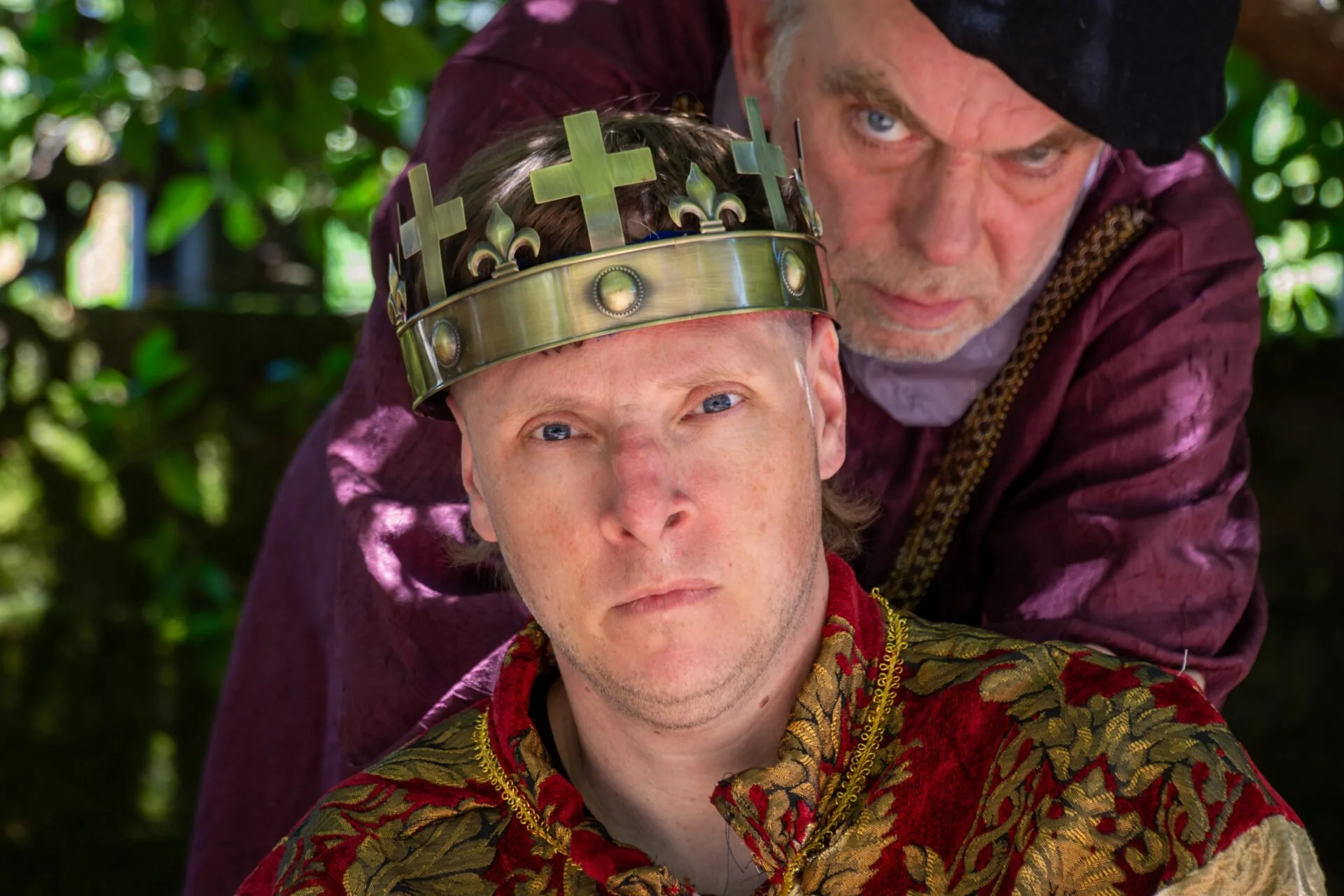 ID: Foreground, a man dressed in royal finery with a crown, staring into the camera. An older man dressed in the purple nobility robe standing behind the king and he is scowling.