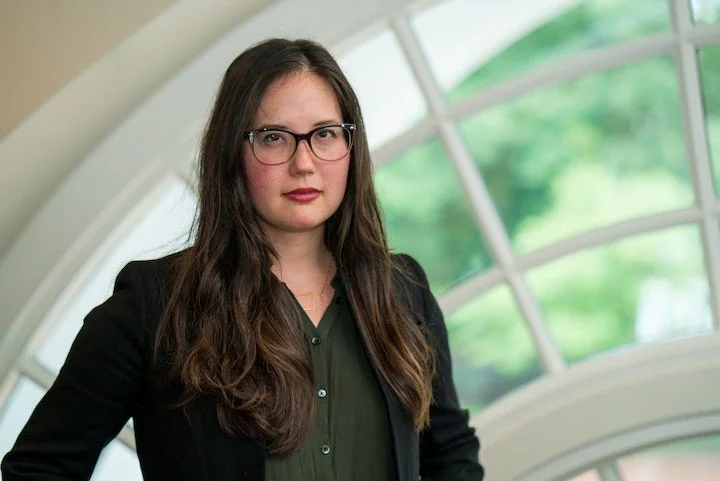 ID: A headshot of an Asian woman with brown hair and black horn-rimmed glasses, wearing a green button-up shirt and black blazer, looking toward the camera, standing in front of the window.