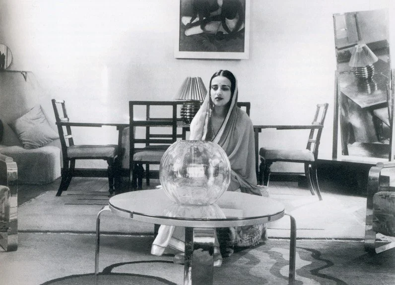 Image Description: Black and white photograph of an Indian woman in Sari, sitting on floor behind a round table, looking at a glass sphere on the floor.