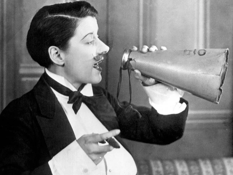 ID: a black and white screen capture of a woman dressing up as a mustached man in a tux holding up a cigar and another one with megaphone.