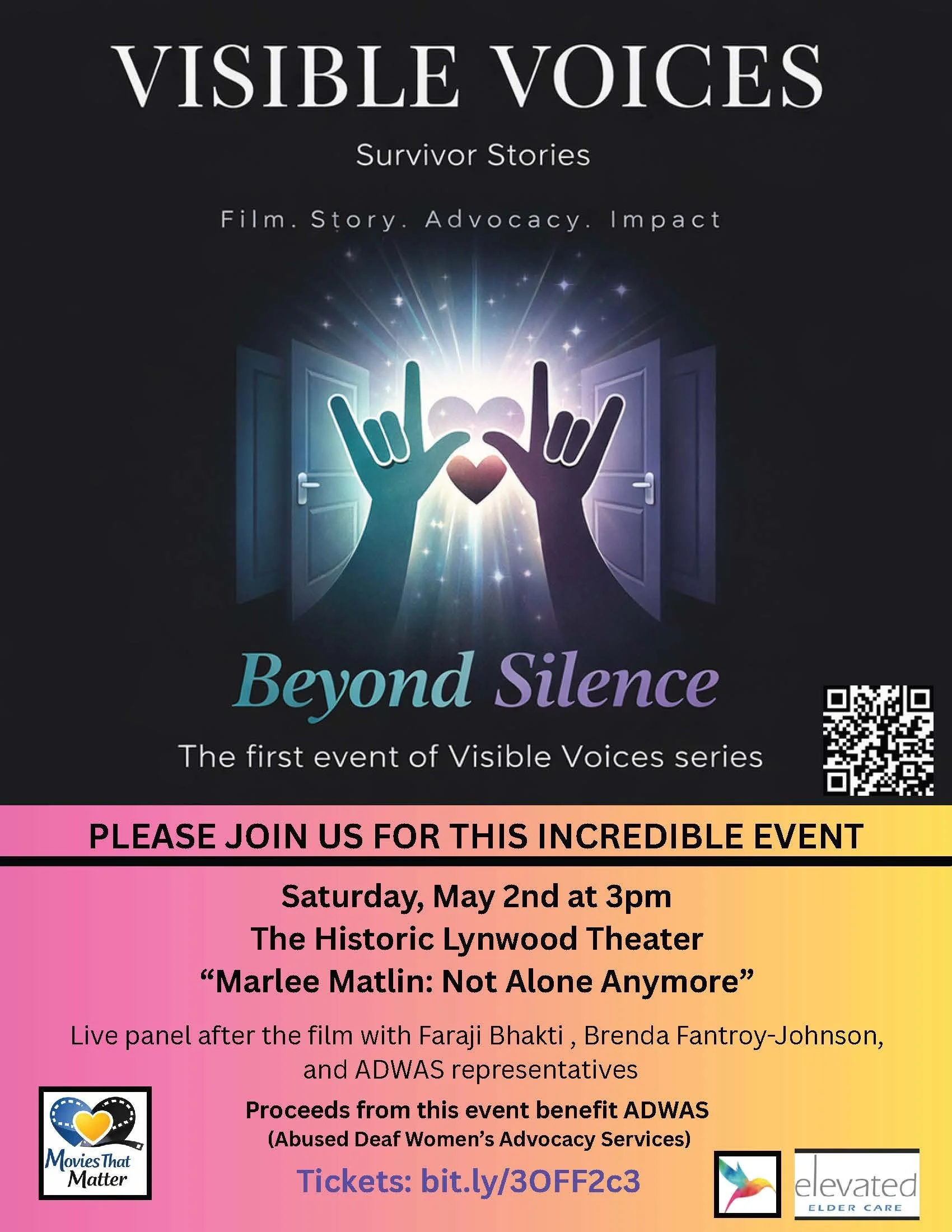 ID: Event poster with a dark, starry background. Title reads “Visible Voices: Survivor Stories,” with the tagline “Film. Story. Advocacy. Impact.” Center image shows two open doors glowing with light, with two hands signing “I love you” in ASL and a heart between them. Event title: “Beyond Silence — The first event of the Visible Voices series.” Details: Saturday, May 2nd at 3pm, Historic Lynwood Theater. Film: “Marlee Matlin: Not Alone Anymore,” followed by a live panel with Faraji Bhakti, Brenda Fantroy-Johnson, and ADWAS representatives. Proceeds benefit ADWAS. Includes ticket link, QR code, and sponsor logos.