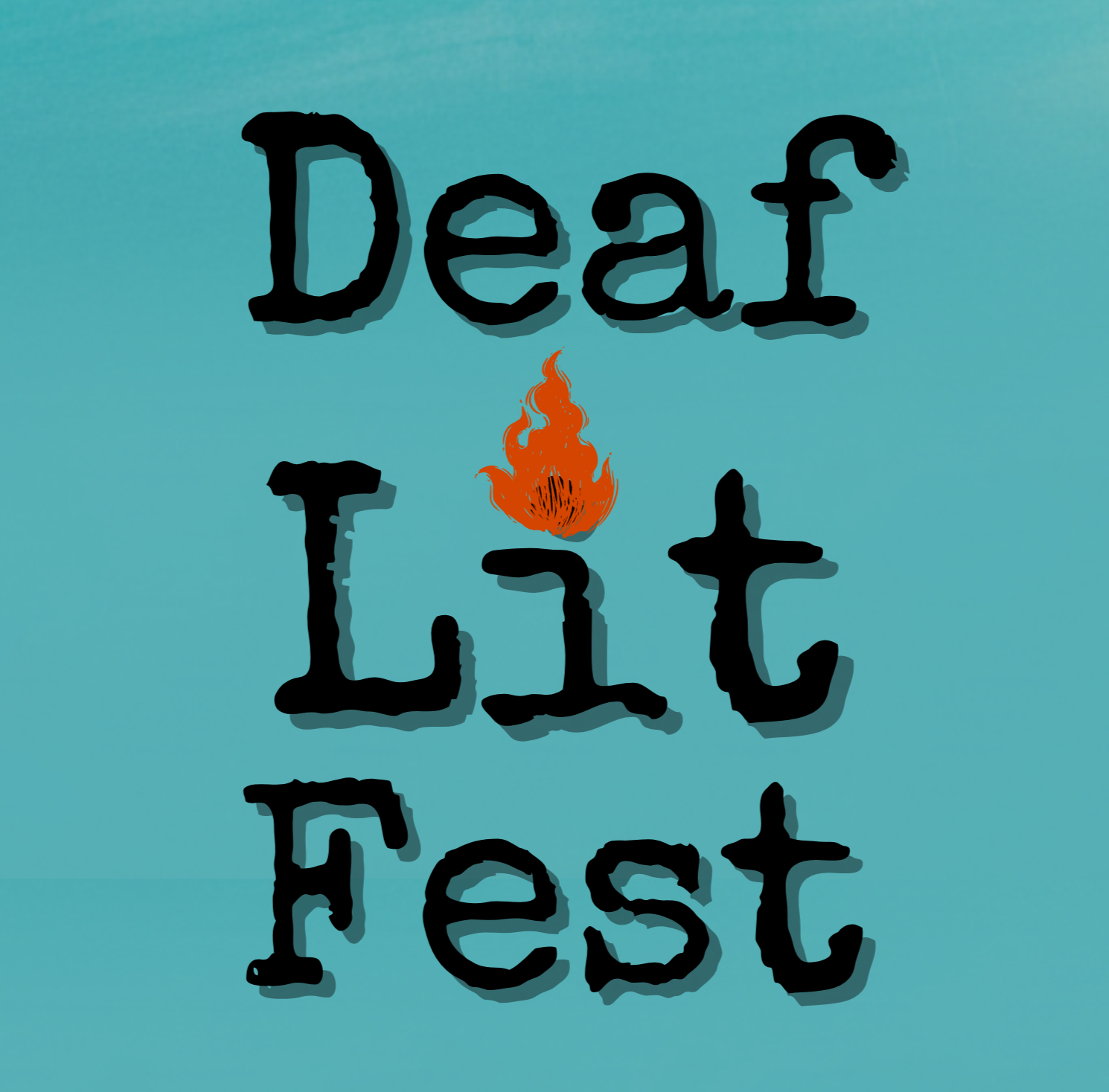ID: a teal background with Deaf Lit Fest with an orange fire for ““i”.
