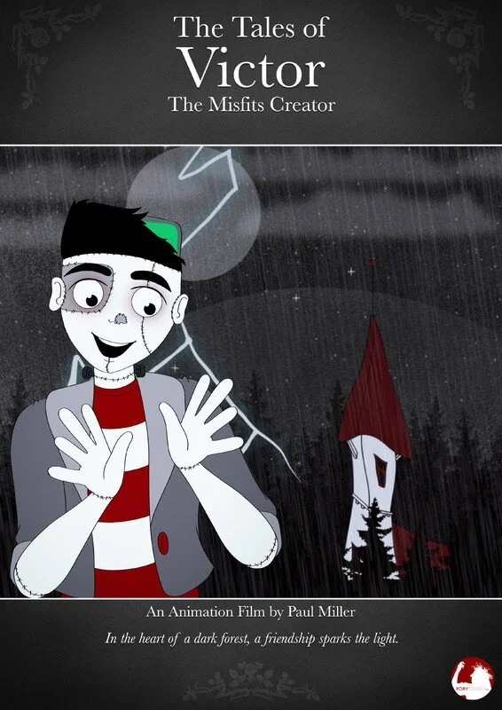 ID: Film poster for “The Tales of Victor” with a subtitle below: The MIsfits Creator. Below is a cartoon illustration of a person with their hands up in front of them. A forest at nighttime is visible behind the person. Text block of credits is at the bottom.