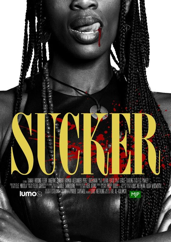 ID: Film poster for “Sucker” with the title across the chest of a black person, with their upper face cut off. They have their mouth open with their tongue sticking out. A text block of credits is on the bottom.