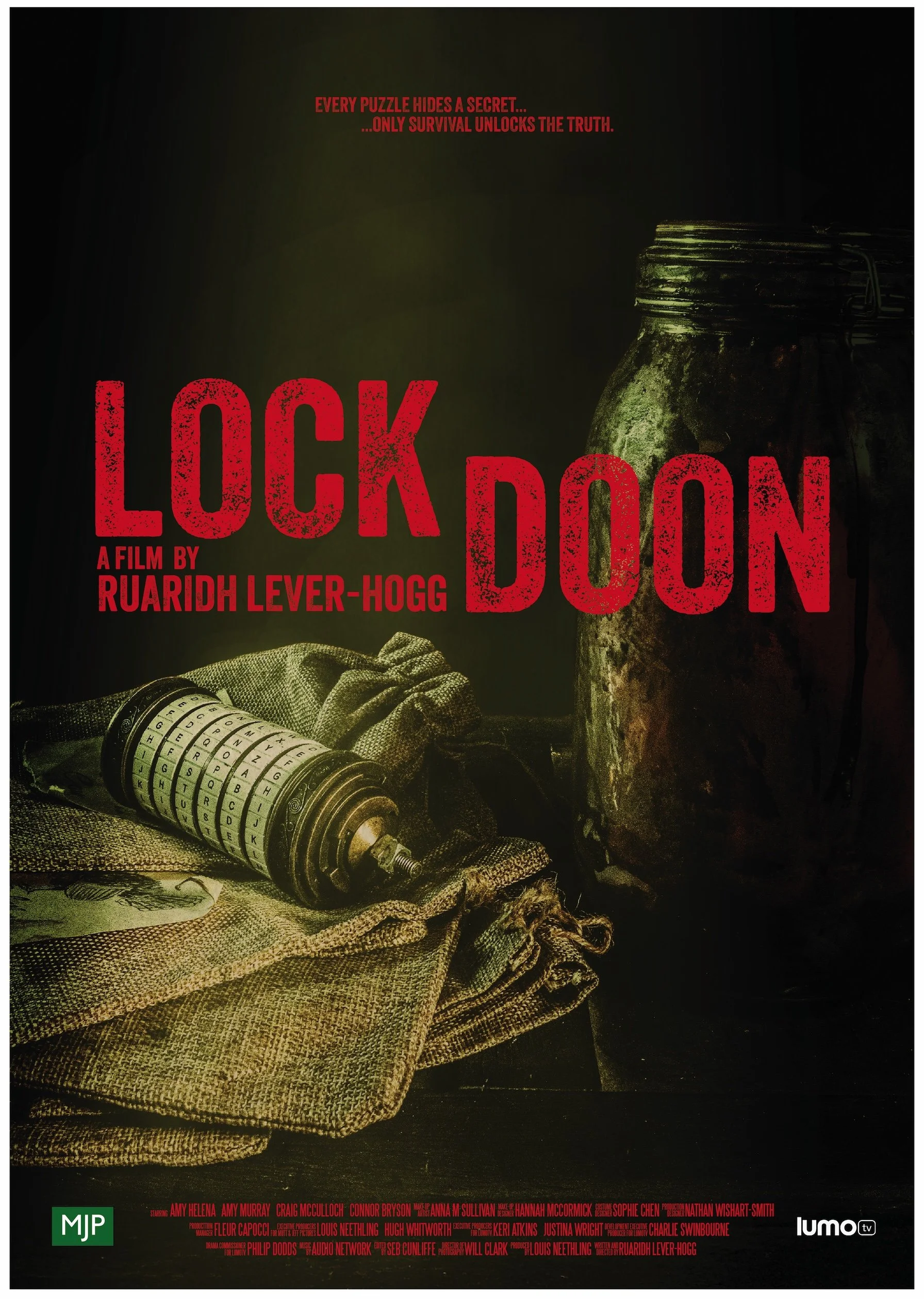 ID: Film poster for “Lockdoon” with the title in white across an image of a cylindrical cipher puzzle with a drawstring bag behind it.