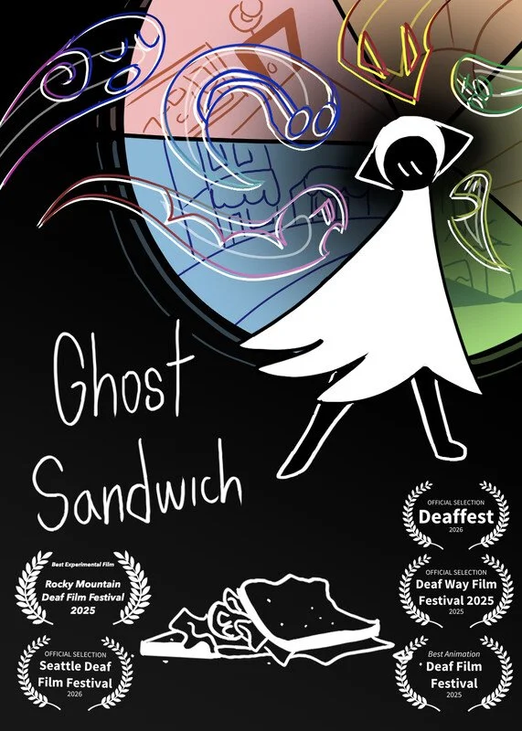 ID: Film poster for “Ghost Sandwich”, with the title on the left side, centered, with award mentions below. A black and white illustration above, shows a woman in a white dress with outlines of ghosts floating around her. Below is an illustration of a lopsided sandwich with the bread sliding off.