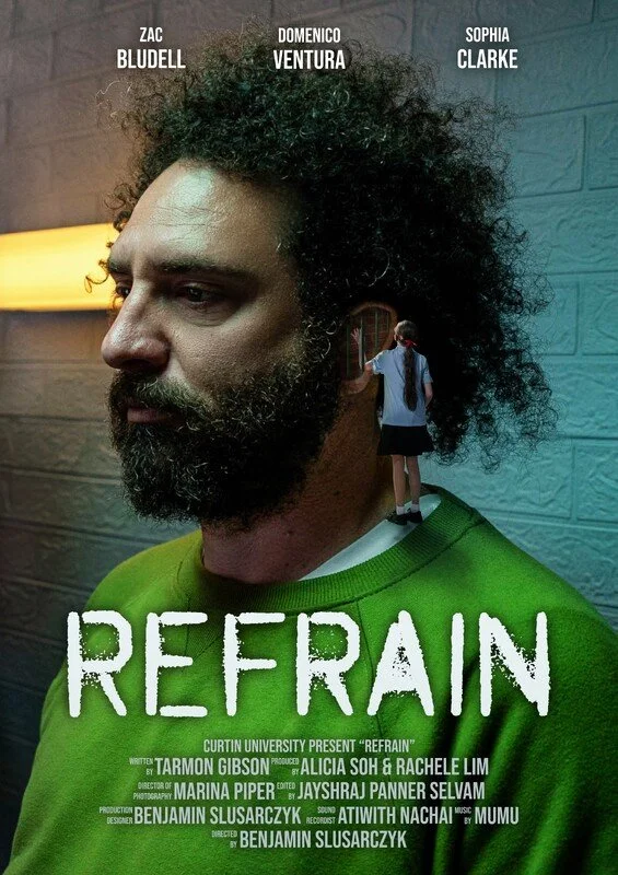 ID: Film poster for “Refrain” with the title across the bottom above a text block of credits. An image of a man looking off to the side. A person stands on his shoulder, whispering into his ear. Across the top are name credits: Zac Bludell, Domenico Ventura, and Sophia Clarke.