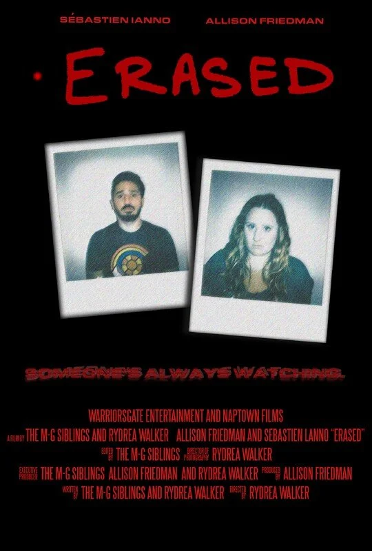 ID: Film poster for “Erased” with the text in red on top, with two black and white polaroids of a man and a woman in center. Text block in red below. Text of names across the top: Sebastien Ianno and Allison Friedman.