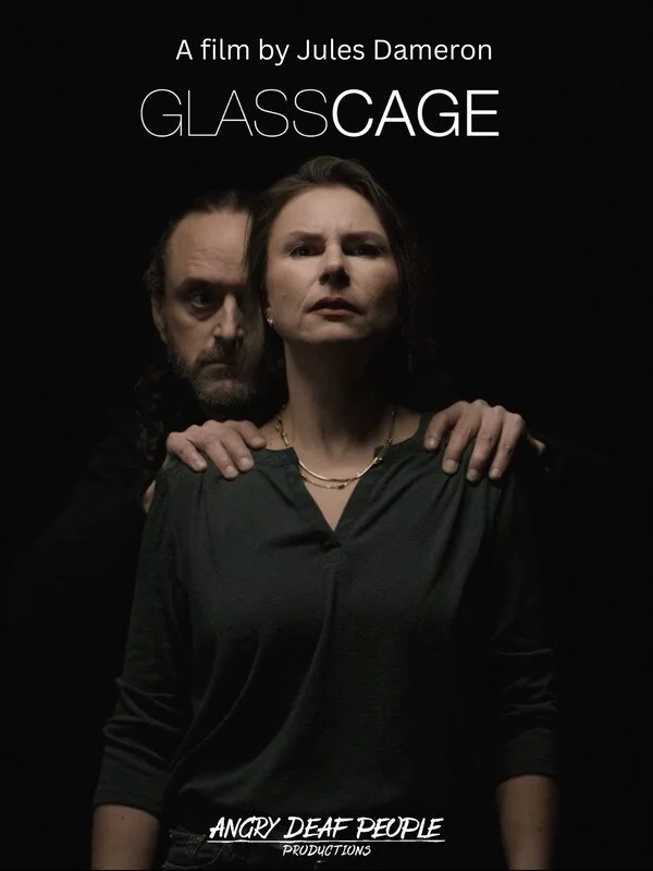 ID: Film poster for “Glass Cage” with the title on top with a subtitle above: “A film by Jules Dameron”. An image of a man grasping the shoulders of a woman below. Across the bottom is another subtitle “Angry Deaf People Productions”.