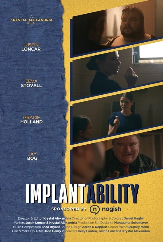 ID: Film poster for “ImplantAbility”, with the title across the bottom above a text block of credits. Four images stacked on the right side show different people, with a stack of names on the left side.