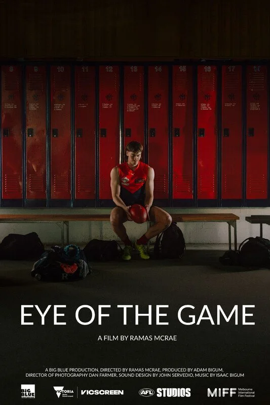 ID: Film poster for “Eye of the Game” with the title in white on the bottom, with a text credit block below. Above is an image of a person sitting on a bench, holding a football, with a red curtain behind them. Subtitle under the title: “A film by Ramas McRae”.