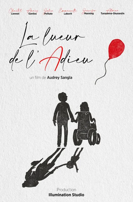 ID: Film poster for “La Coeur de L’Adieu” (The Power of Goodbye). A silhouette of a person standing next to a person in a wheelchair, with their shadows behind them. The shadow shows the taller person holding the hand of a child walking. A red balloon flies away from them. Text at bottom: “Production Illumination Studio”.