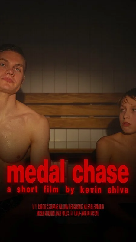 ID: Film poster for “Medal Chase”, with the title in red across the bottom, with a subtitle below: “a short film by Kevin Shiva”, and a text block of credits at the bottom. The image above shows a young child looking at an adult while they sit together on a bench.