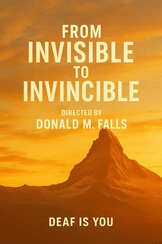 ID: Film poster for “From Invisible to Invincible” with the title in center, with subtitle below: “Directed by Donald M. Falls”. An orange-brown tinted image of a landscape with a rock outcropping. Subtitle across the top: “Deaf is you”.