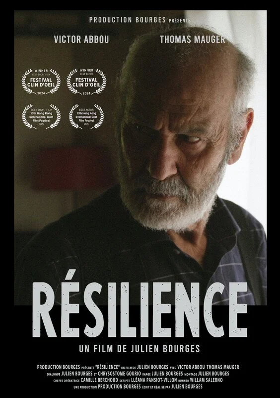 ID: Film poster for “Résilience”, with the title across the bottom with a text block of credits below. Above is an image of a resigned older man looking to the side. Film award mentions are grouped on the top left corner, with a subtitle above: Production Bourges presents… and names below: Victor Abbou, Thomas Mauger.
