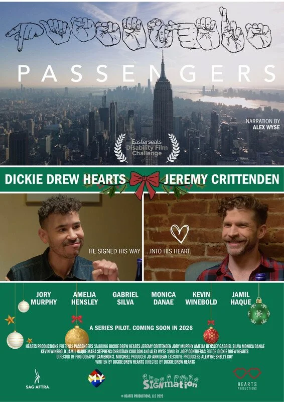 ID: Film poster for “Passengers” with the title in both text and ASL fingerspelling across the top. Image of a landscape view of New York City below, with two snapshots side by side showing two different men, with text linking the images: “He signed his way… into his heart.” Text between the images: “Dickie Drew Hearts and Jeremy Crittenden” with additional names below the images. Text block of credits on the bottom.