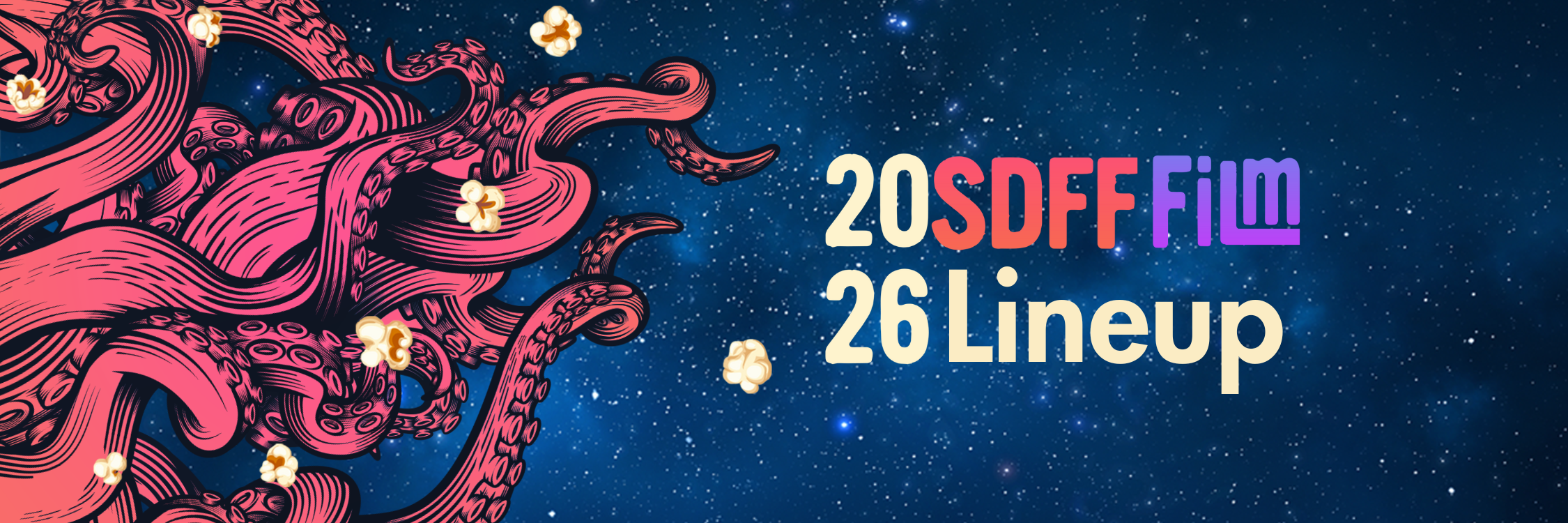 ID: Seattle Deaf Film banner of 2026 SDFF Film Lineup with octopus’ tentacles curling across with some popcorn floating in the starry space.